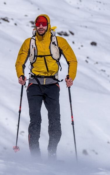Ukážka vrstvenia oblečenia pre mužov pre zimné skialpové výstupy s ľahkým vetrom alebo padajúcimi krupičkami snehu.